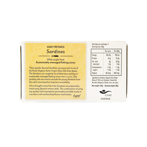 These quality Spanish Sardines are preserved in one of the finest Organic Extra Virgin Olive Oils from Spain. The Sardines are caught by local fishermen working in sustainably managed fishing zones. Size grading nets are used to exclude the young Sardines from the catch ensuring their long term availability.
